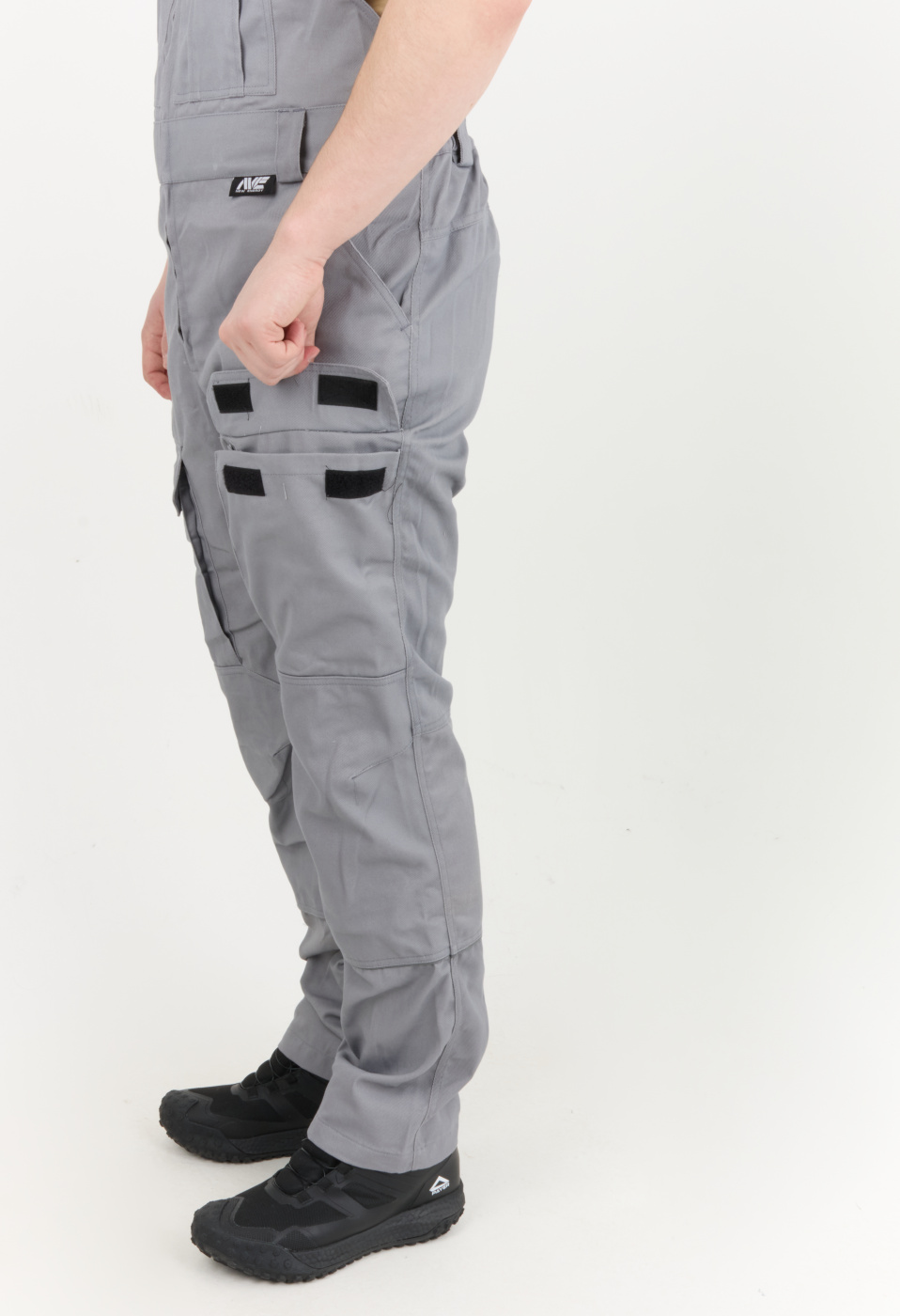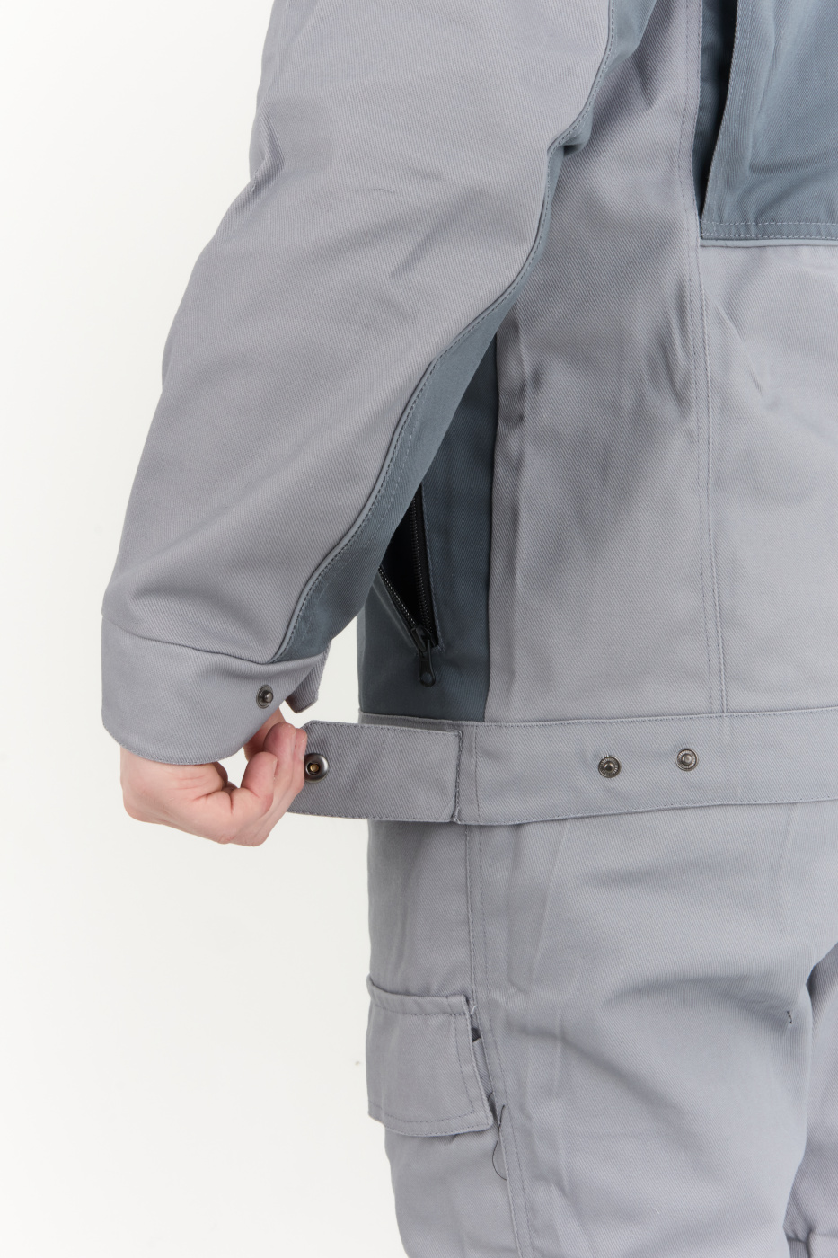 Рабочий комплект выполнен в сером цвете, что позволяет его легко сочетать с другими элементами рабочей одежды